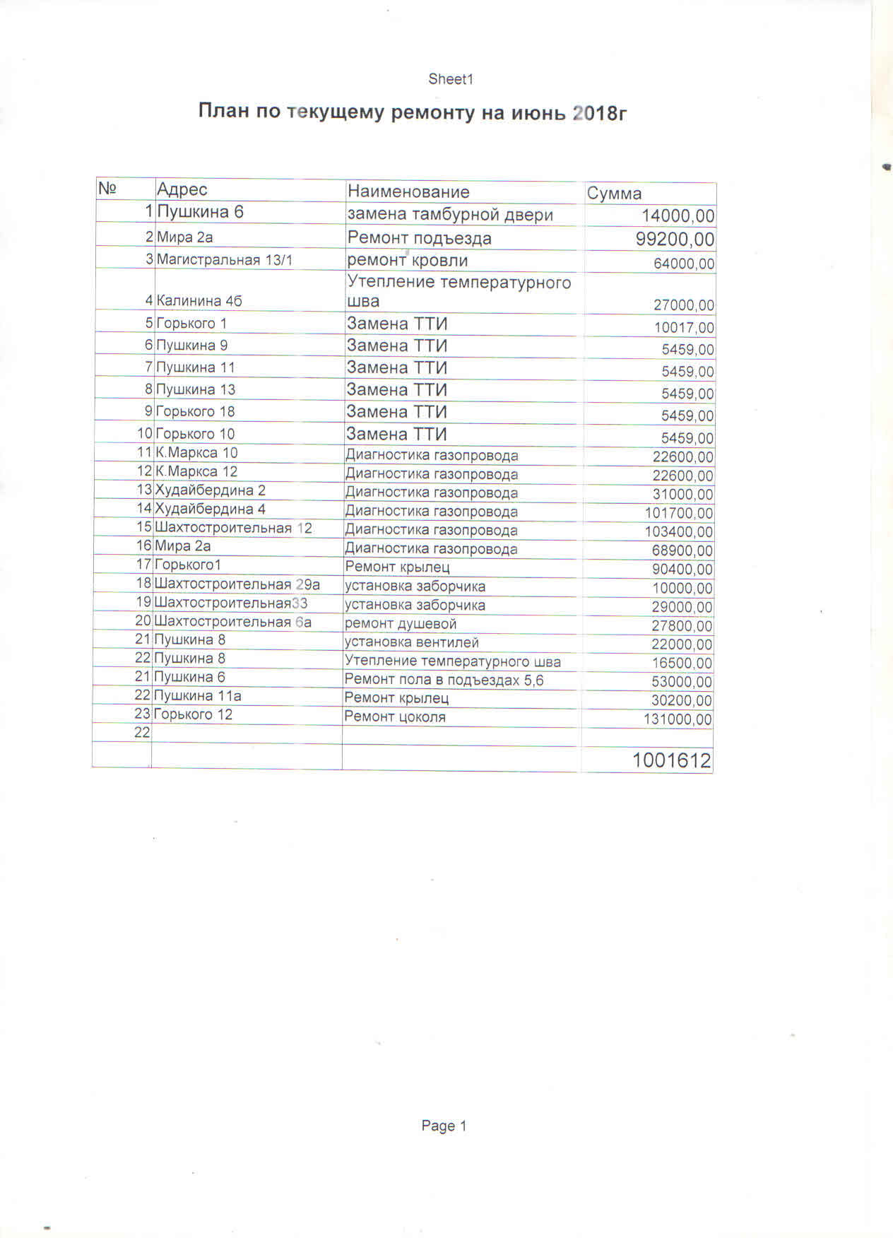План по текущему ремонту на июнь 2018 года