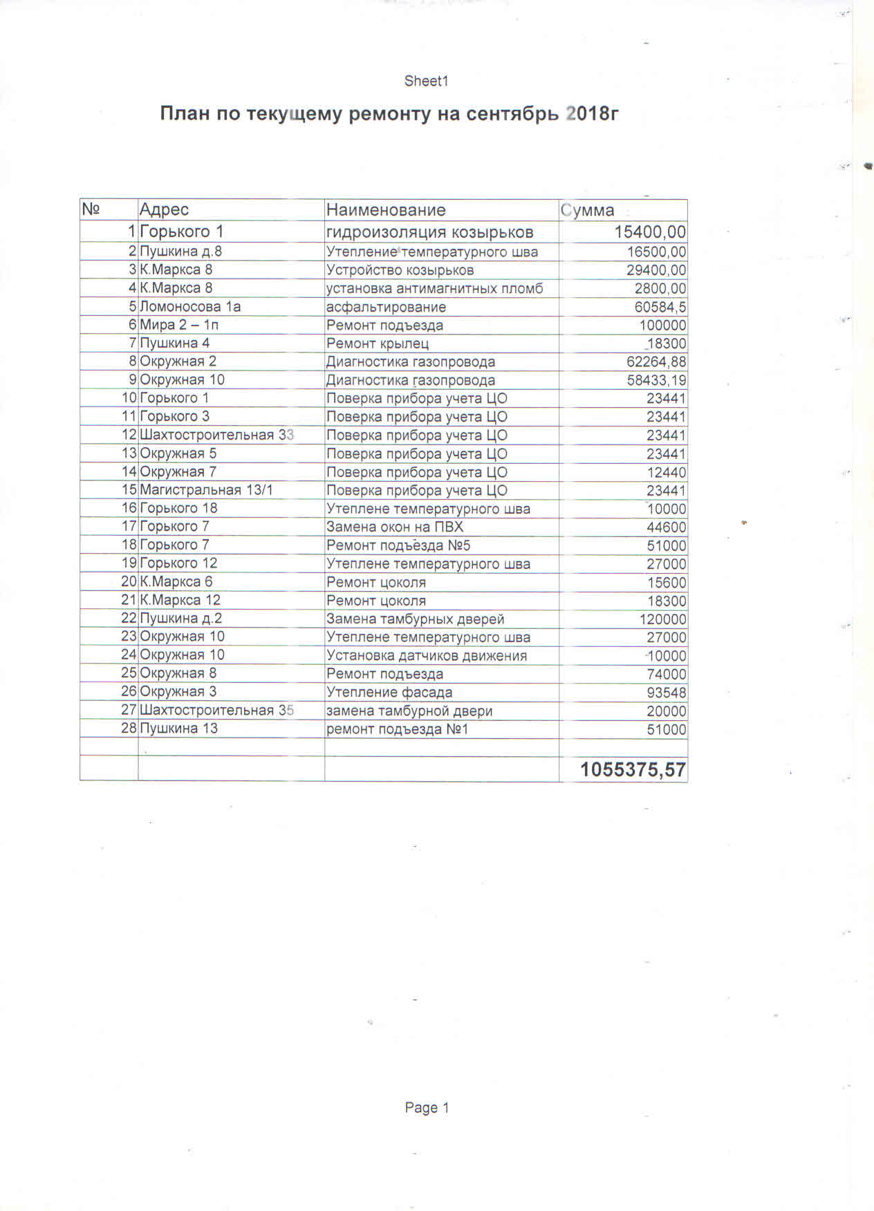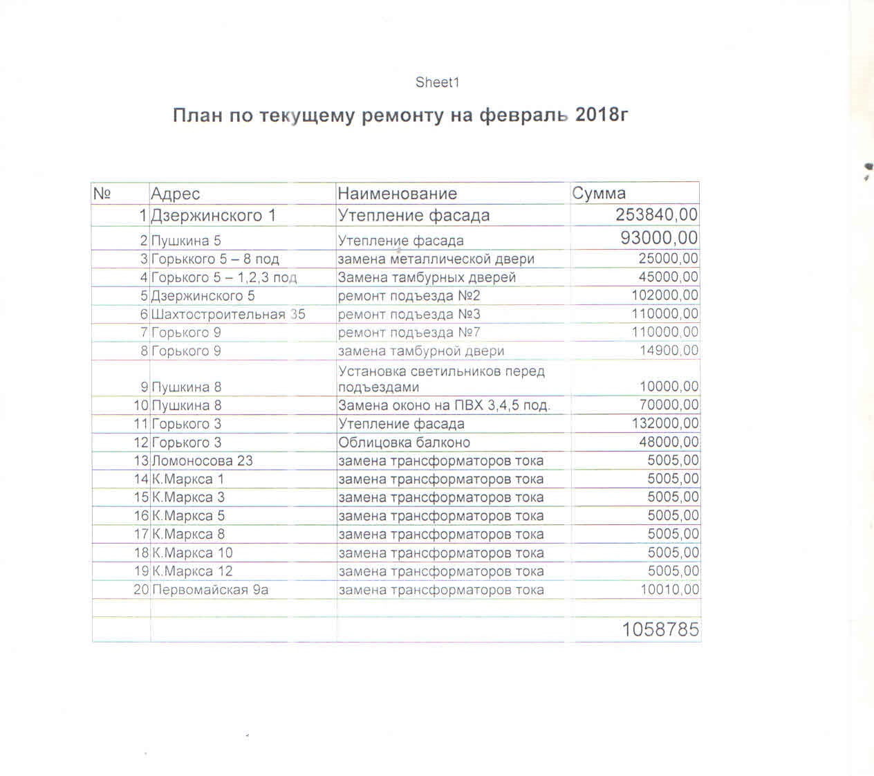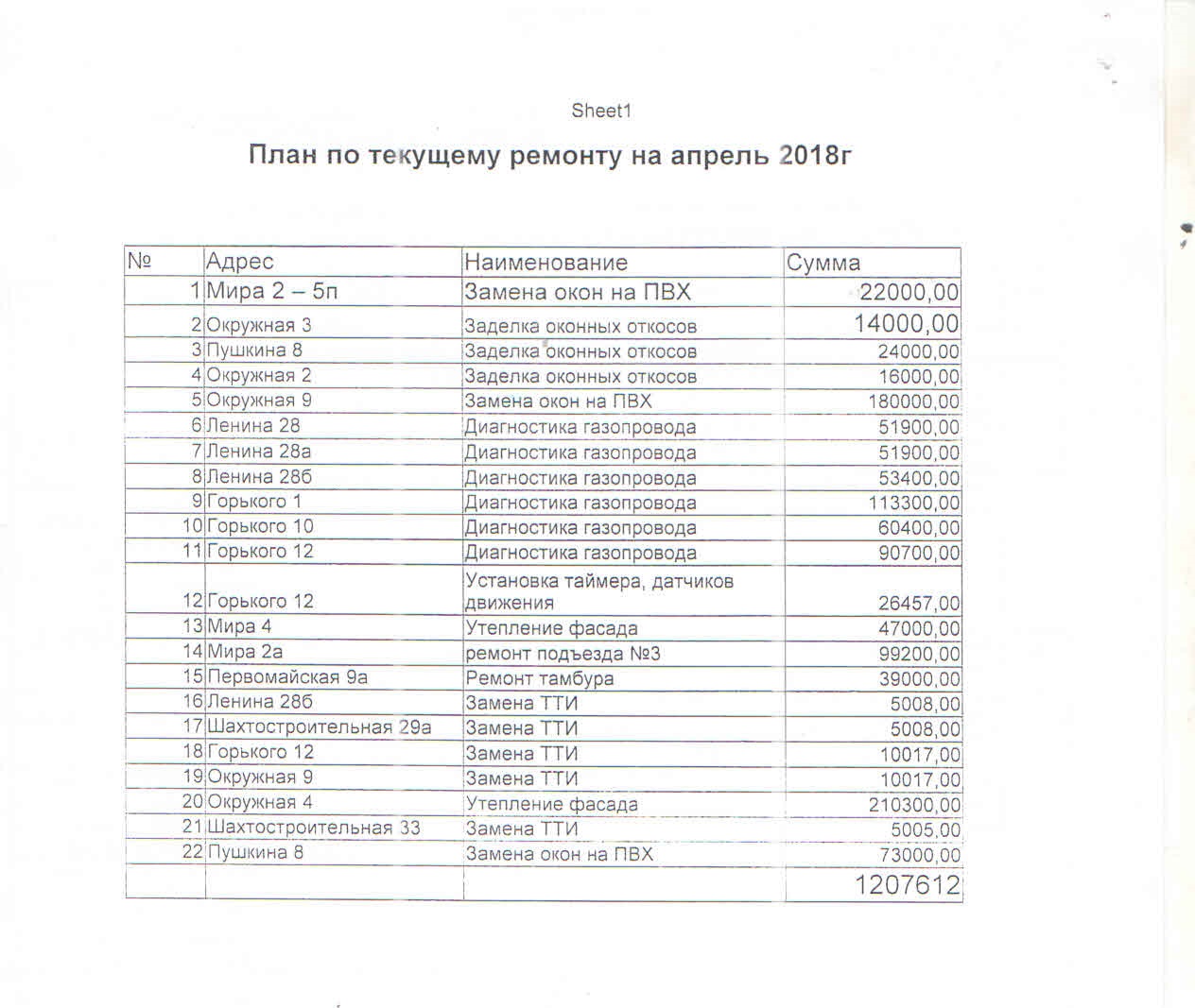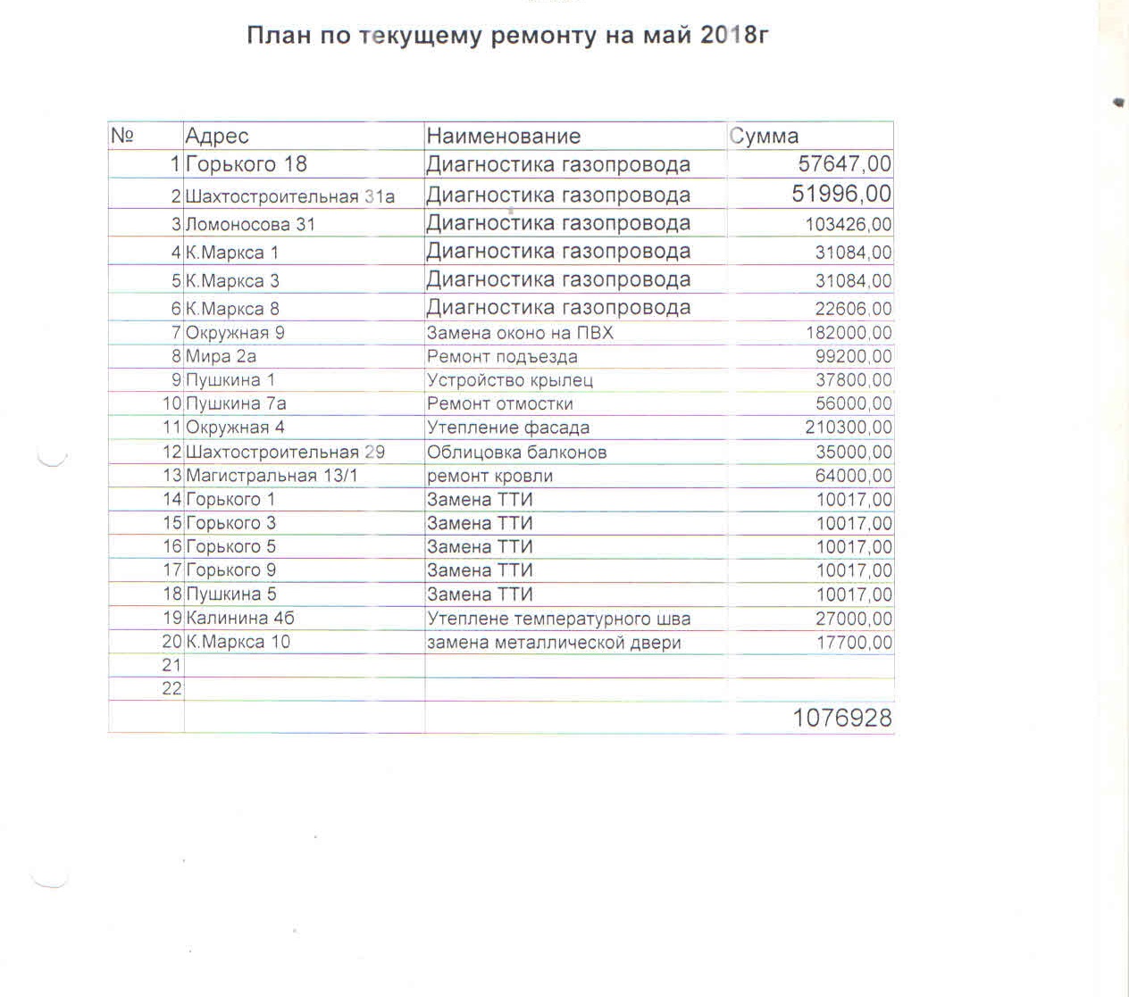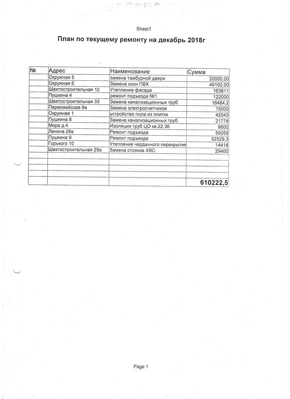 План по текущему ремонту на май 2018 года