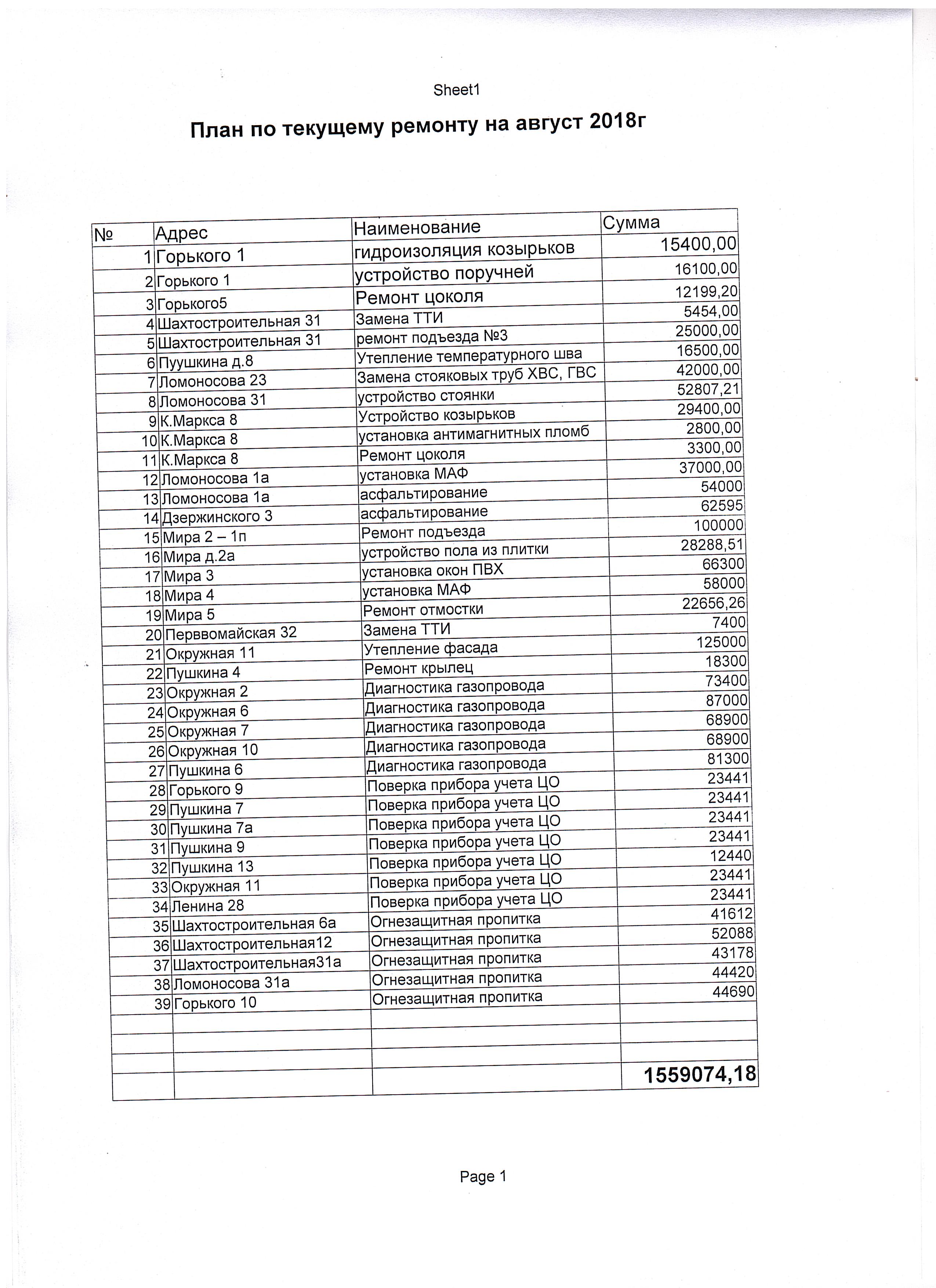 План по текущему ремонту на август 2018 года