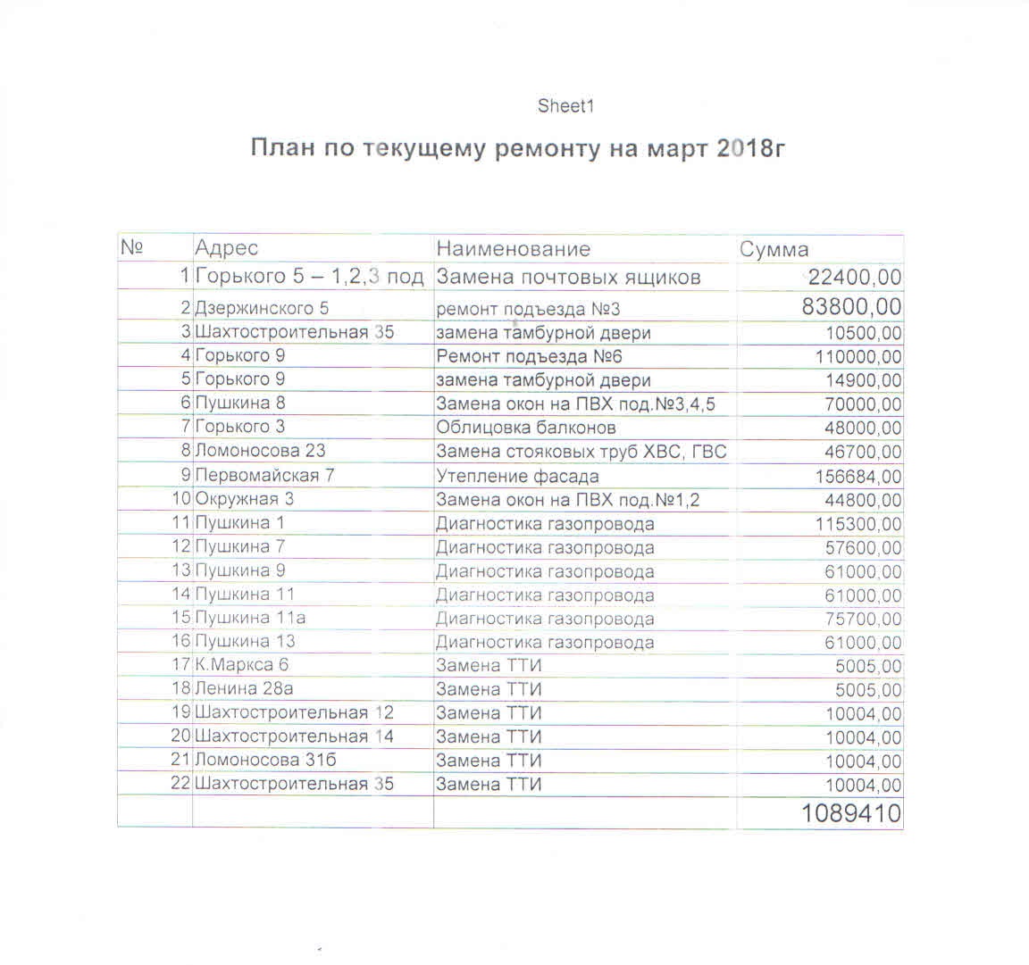 План по текущему ремонту на март 2018 года